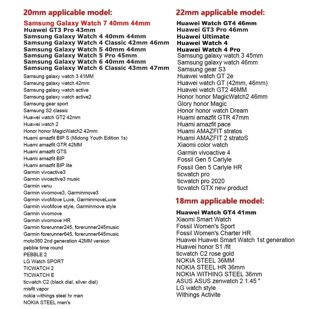 • Compatibility: Fits most smartwatches including Samsung Galaxy Watch 4, 5, 6 series and Huawei GT3, GT4, Pro series.