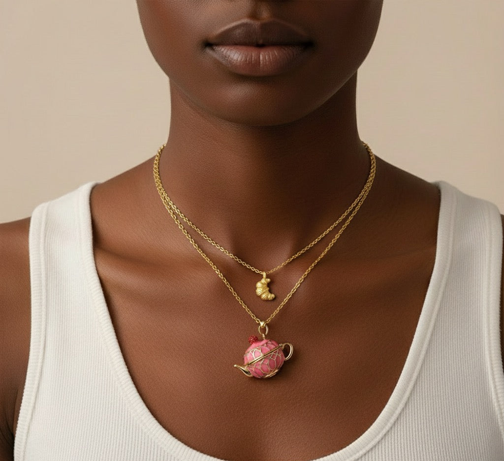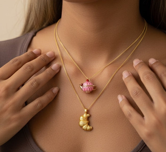 Bring a little joie de vivre to your style with this dreamy duo inspired by cozy mornings in Paris. The bundle includes a golden croissant pendant and a whimsical enamel teapot locket, making it the perfect set for pastry lovers, tea enthusiasts, and anyone who adores a touch of playful elegance.