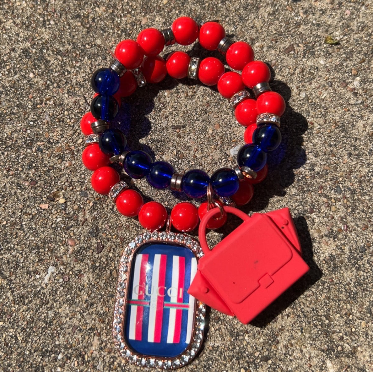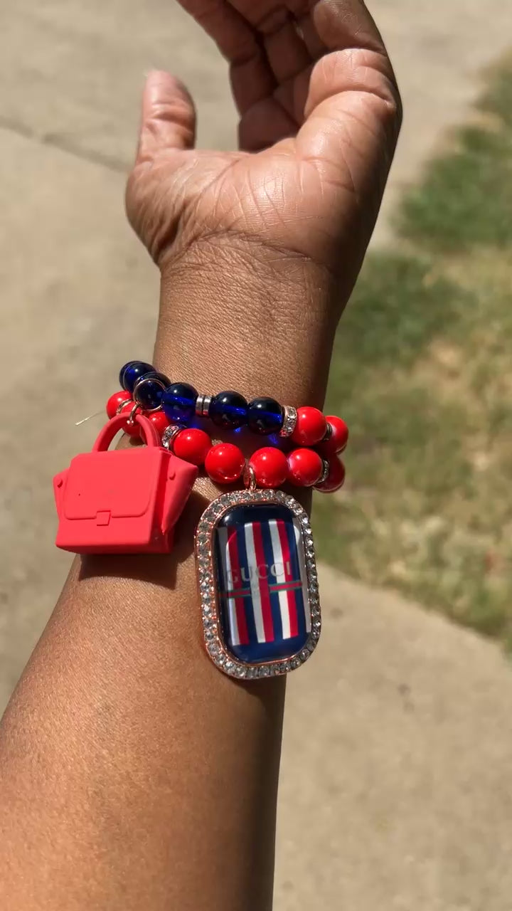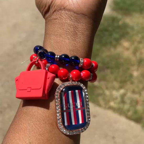 Step into bold fashion with the Runway Stripes & Bag Dreams bracelet set. Featuring glossy red and blue beads, rhinestone accents, and luxe-inspired charms (a Gucci-style striped pendant + a chic mini handbag), this piece is perfect for anyone who loves runway glam with a playful twist.