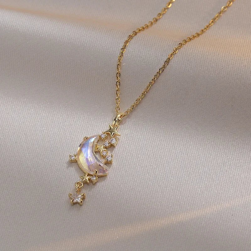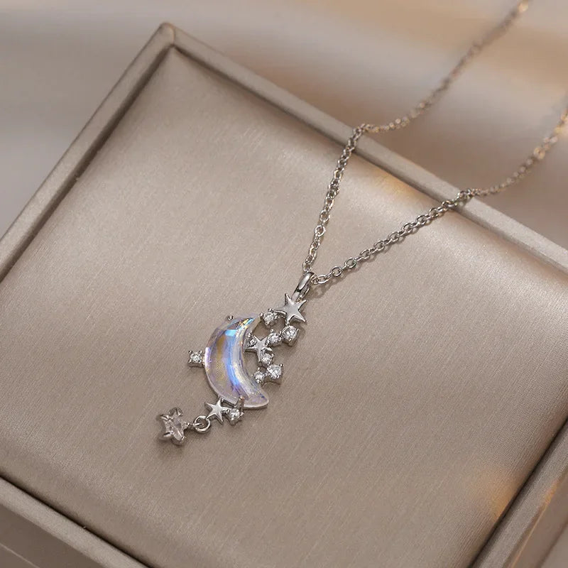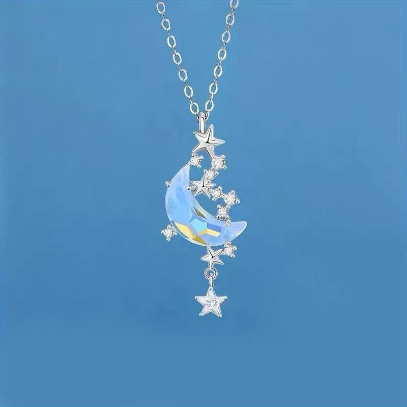 Catch the beauty of the night sky with this enchanting necklace. Featuring a luminous moonstone moon paired with sparkling zircon stars, it’s the perfect piece to channel dreamy elegance and cosmic charm.