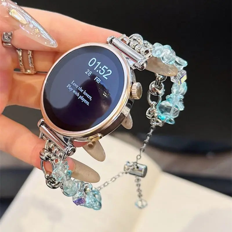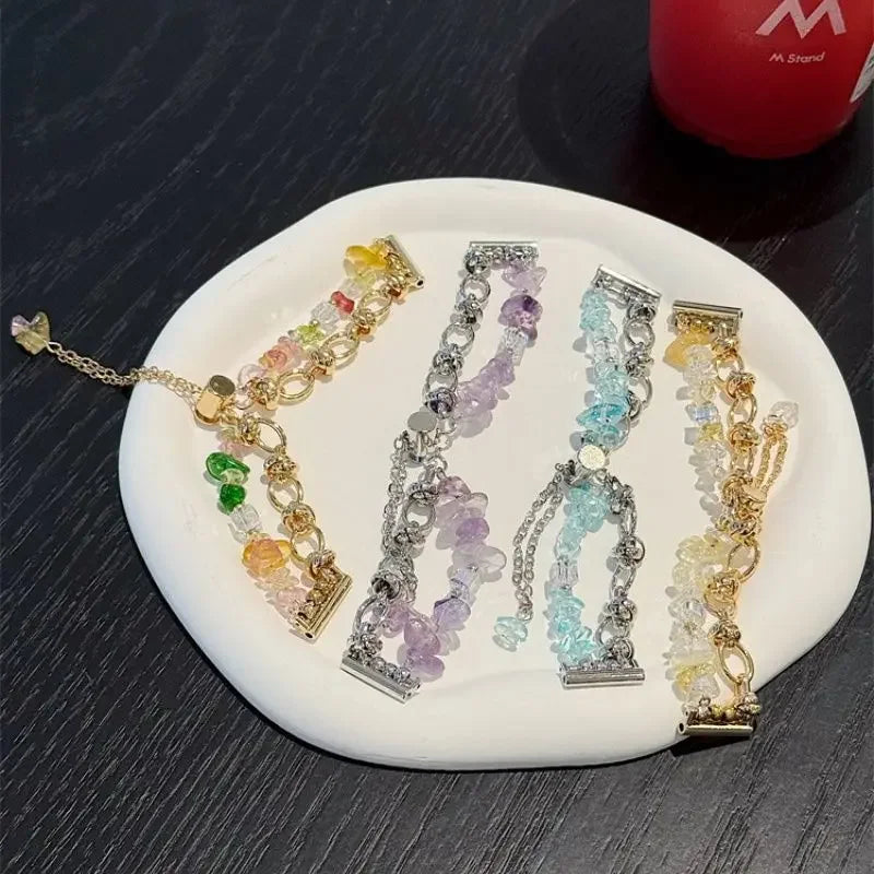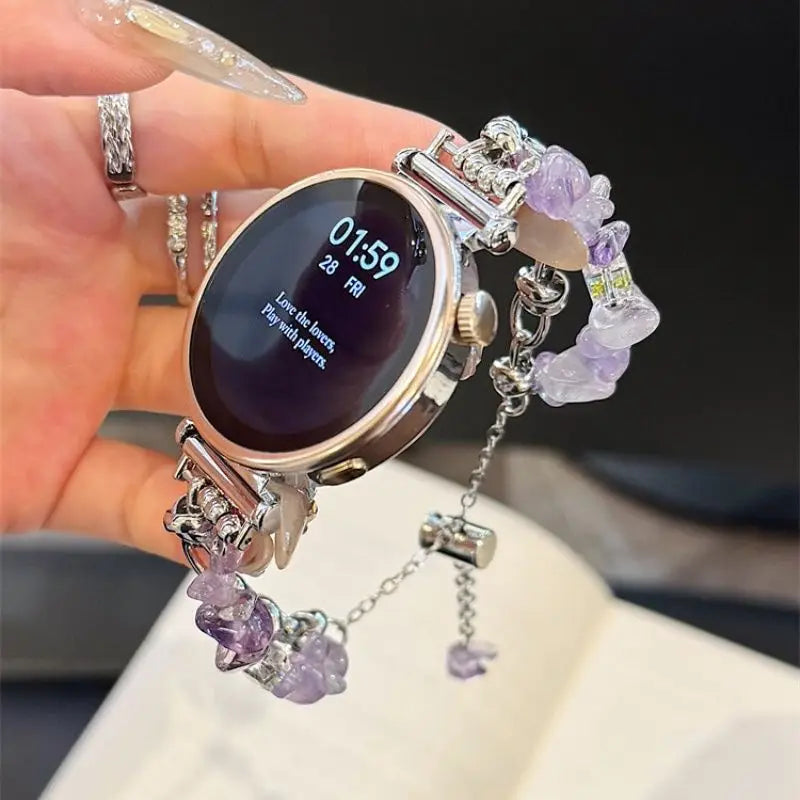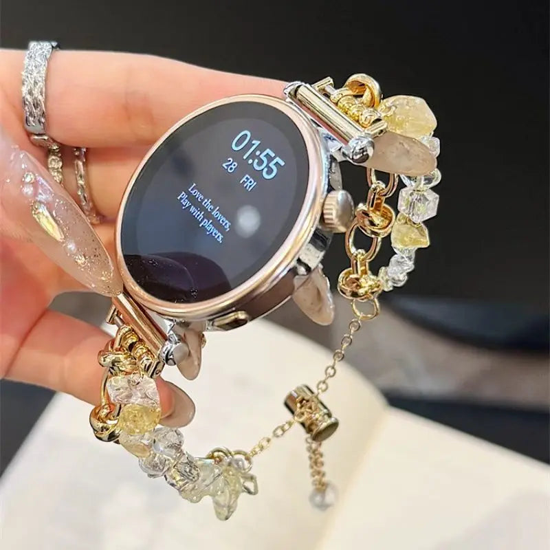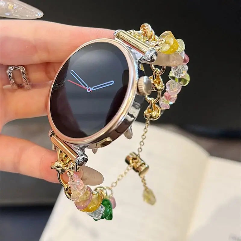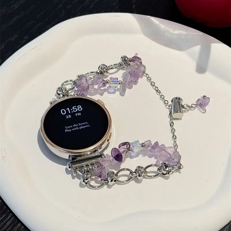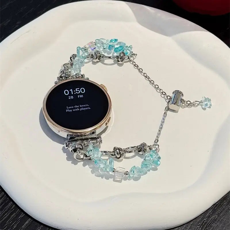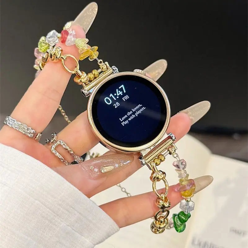 Give your smartwatch a touch of elegance with our Crystal Gemstone Watch Band. Featuring natural stone-inspired beads paired with chic chain links, this bracelet-style strap blends modern style with timeless charm. Perfect for everyday wear or dressing up your smartwatch for special occasions.