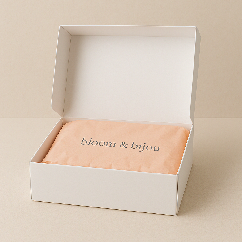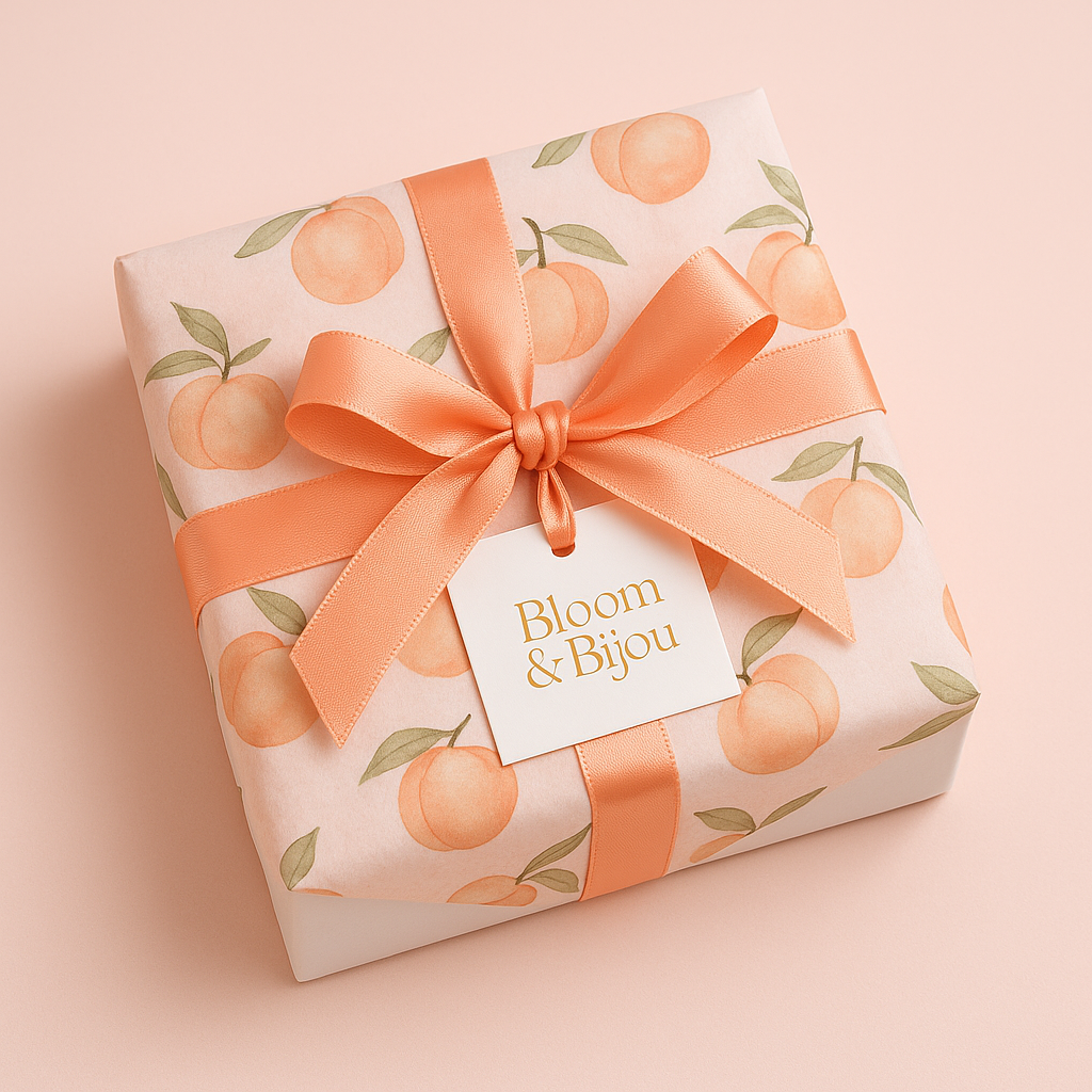Make your gift unforgettable π Our Wrapped in Magic service transforms your order into a ready-to-gift treasure. Featuring our exclusive peach-inspired wrap, each package is styled with tissue paper, shredded filler paper, and a touch of Bloom & Bijou sparkle β¨