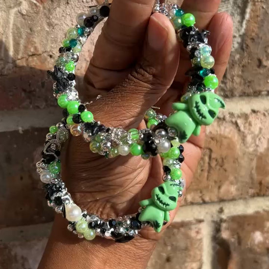 Creepy but make it cute 💚 These hoops feature green shimmer beads, pearls, crystals, and spooky Oogie Boogie charms. A playful pop of Halloween spirit that glows with every outfit.