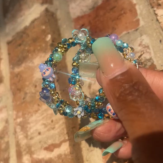 Dive into whimsy with the Ocean Labububu Hoops—where sparkling ocean blues meet playful monster charm magic. These hoops feature shimmering aqua, teal, and pastel crystals, accented with golden beads and topped with the cutest Labububu monster charms. It’s like wearing a piece of the sea with a cheeky little friend to keep you company.