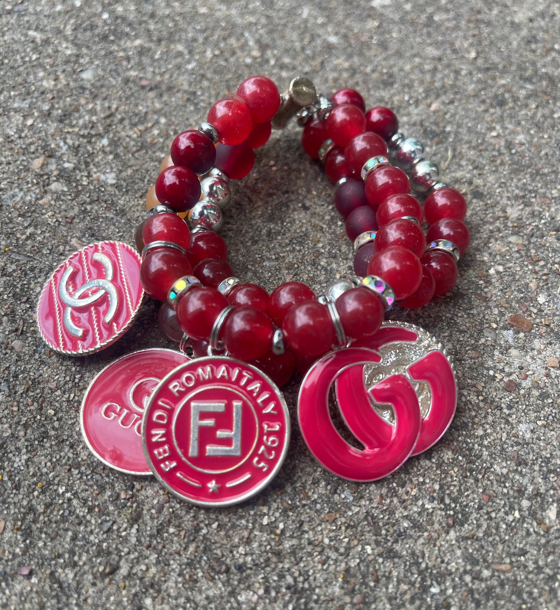A stack of rich red beads decorated with Gucci and Fendi-inspired charms. The boldest way to wear your designer dreams on your wrist.