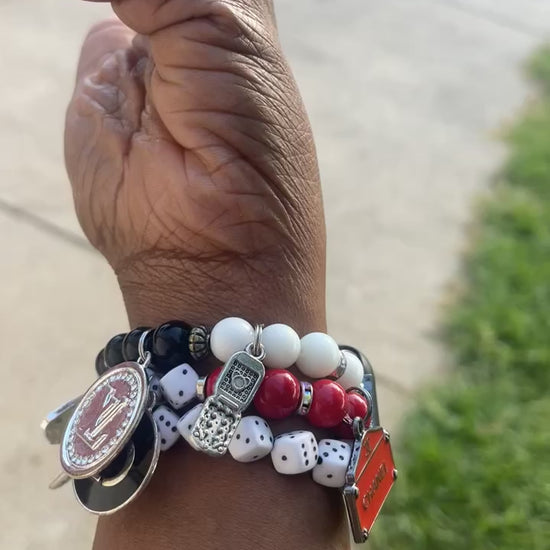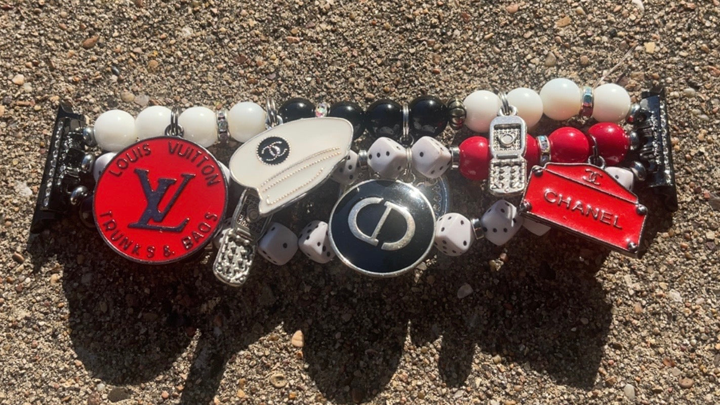 Red, white, and black dice beads stacked with luxury charms from Dior, Chanel, and LV. Finished with a retro flip phone charm — a bracelet that’s bold, lucky, and ready for the spotlight.