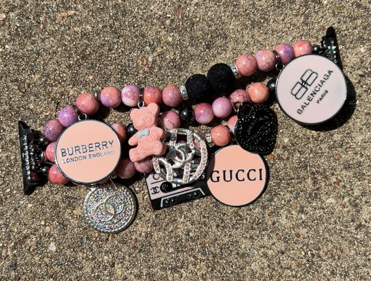 Make a statement with Chanel & Bears, the ultimate mix of glam and playful energy. This bracelet blends marble pink, deep purple, and black velvet-textured beads with sparkling rhinestone accents. Finished with designer-inspired charms (Chanel, Gucci, Burberry, Balenciaga) and a luxe bear charm, itβs bold, girly, and unforgettable.