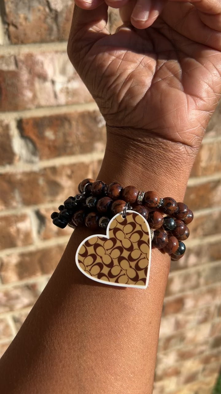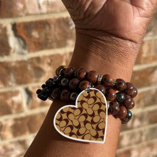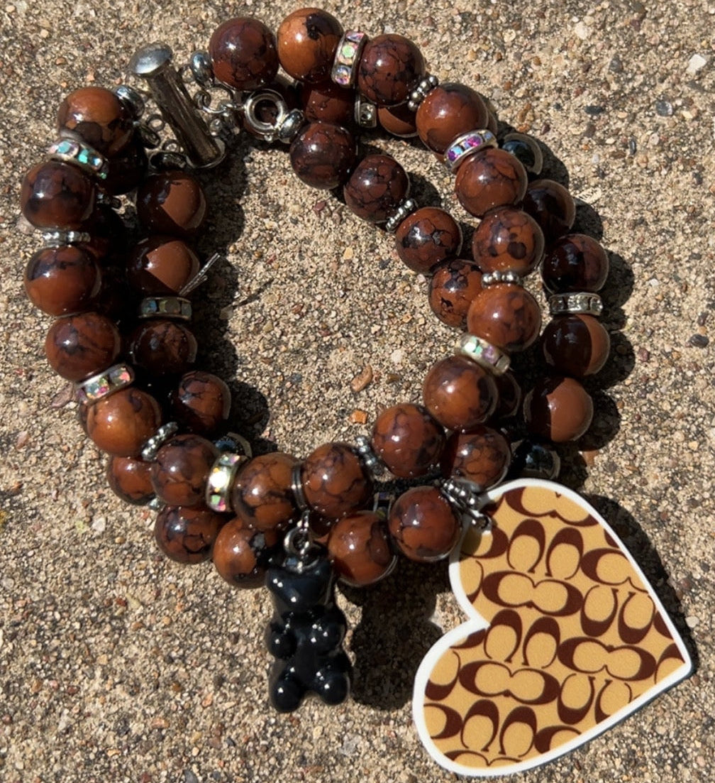 Classic meets playful in Coach Heart & Bear. This bracelet stacks warm brown marble beads with sparkling rhinestone spacers, then finishes with a bold Coach-inspired heart charm and a mini black gummy bear for a cute twist. Itβs the perfect mix of timeless and fun.