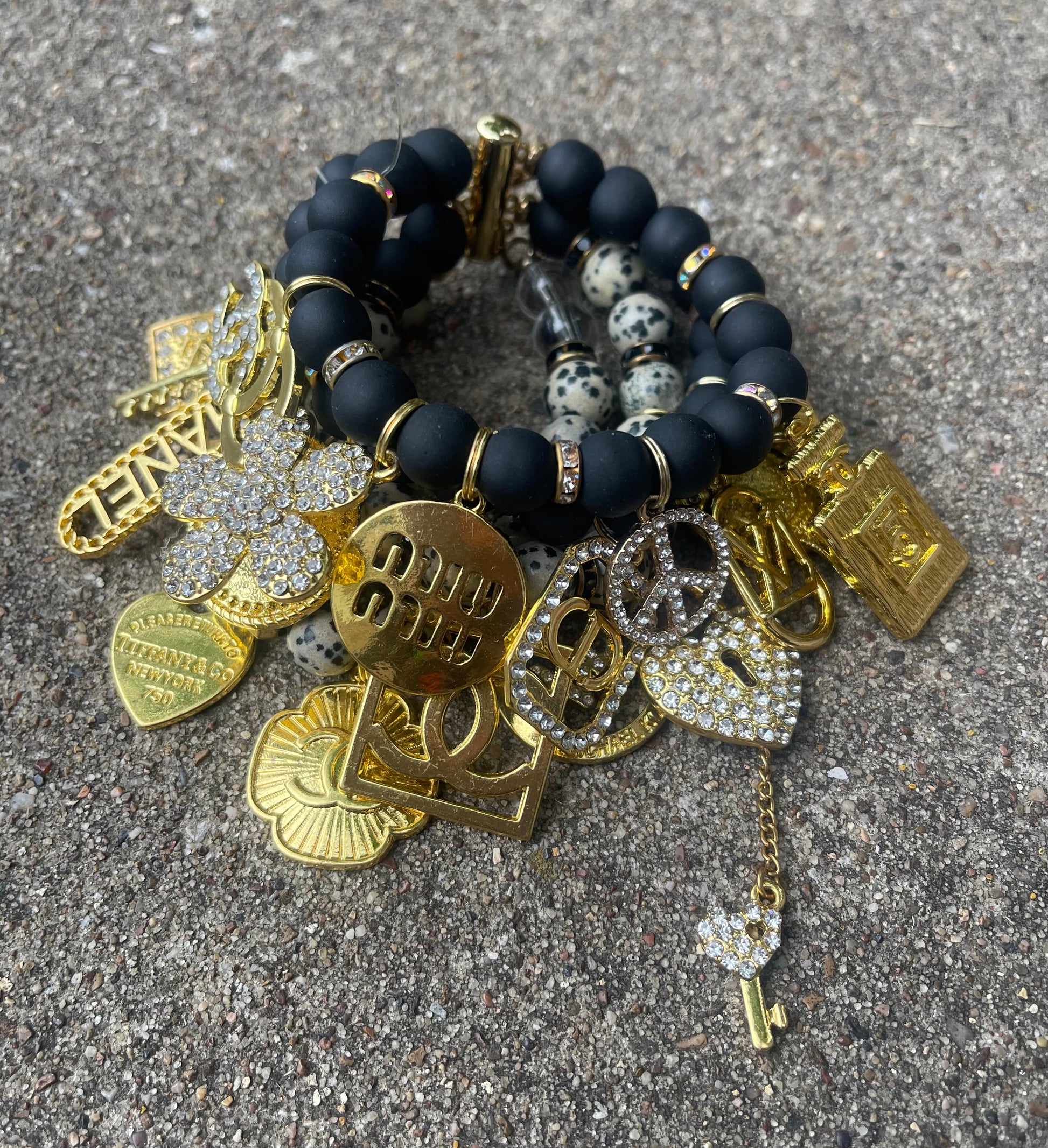 Matte black and Dalmatian beads covered in gold luxe charms — Chanel, Dior, Miu Miu, Tiffany, perfume bottles, locks & keys. A stacked, over-the-top golden dream.