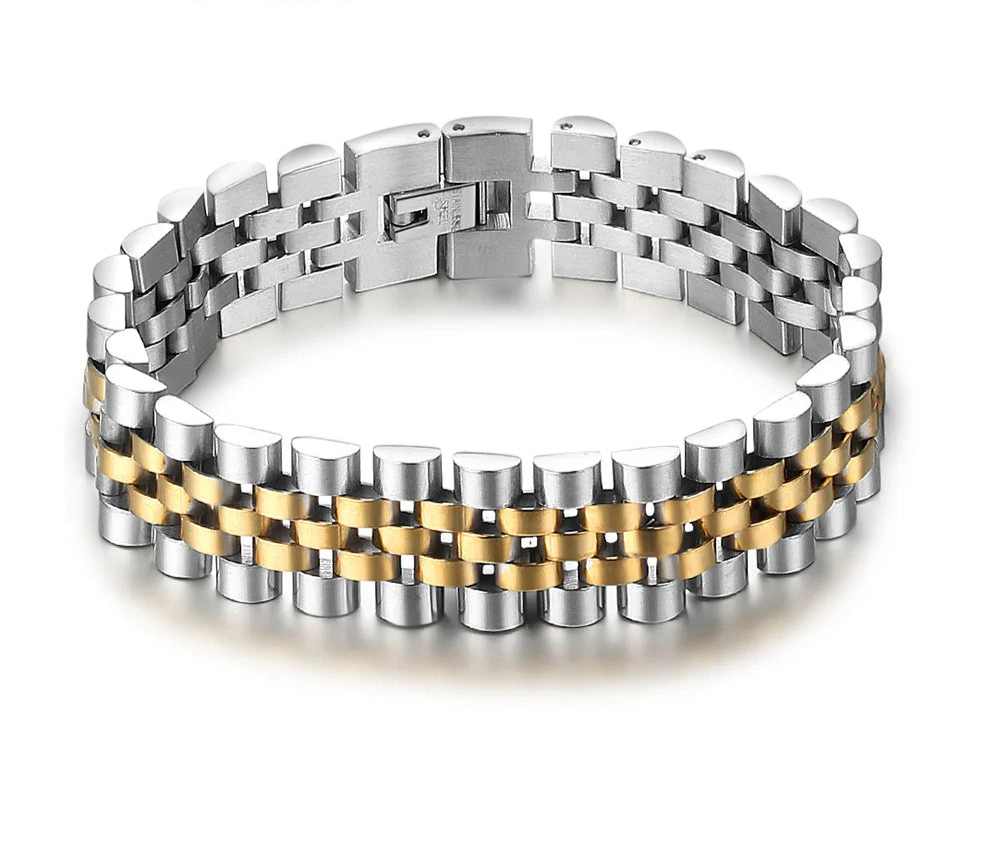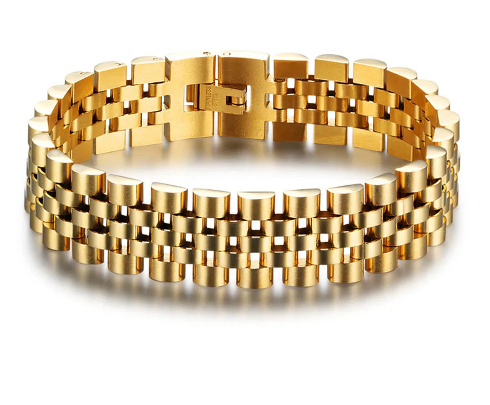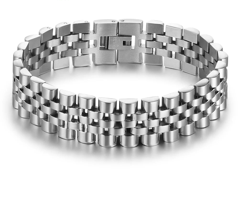 Command attention with the Regal Link Cuff, a bold stainless-steel bracelet crafted with a luxury watchband-inspired design. Its sleek, interlocked links create a modern yet timeless look, perfect for women who value both classic and versatility.