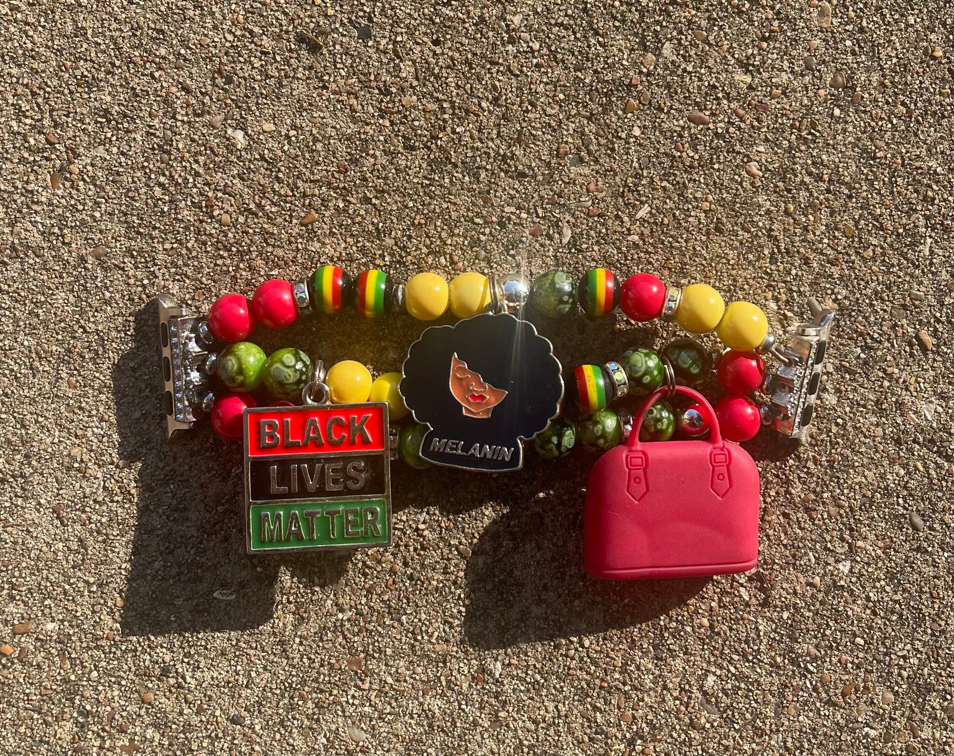 Red, yellow, and green beads decorated with “Black Lives Matter” + “Melanin” charms, paired with a bold red purse. A bracelet that’s powerful, cultural, and unapologetically strong.