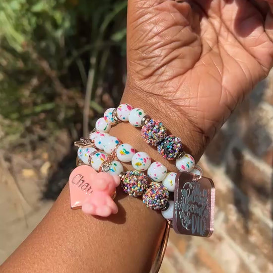 Think dreamy confection of pastel pink, rose gold, and confetti-sprinkled beads topped with charms. Think cupcake, glitter, and the main-character is you. It gives sweet-girly, fun and soft-glam all rolled into an apple watch bracelet.