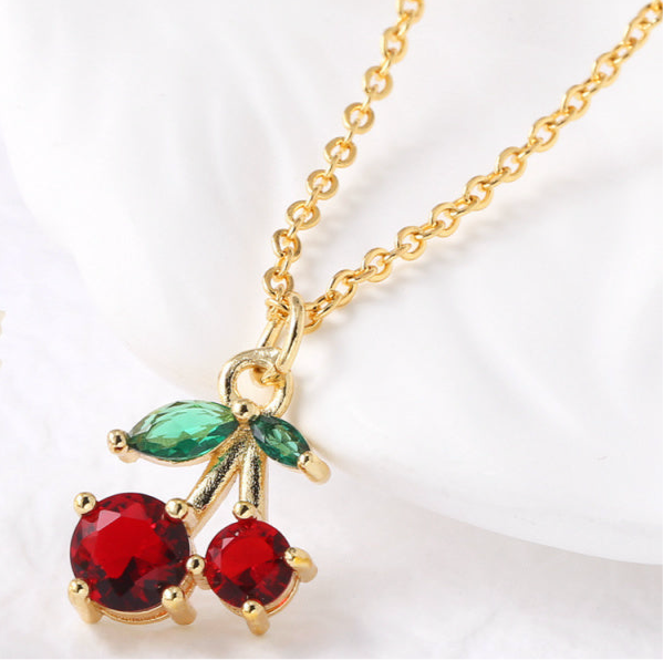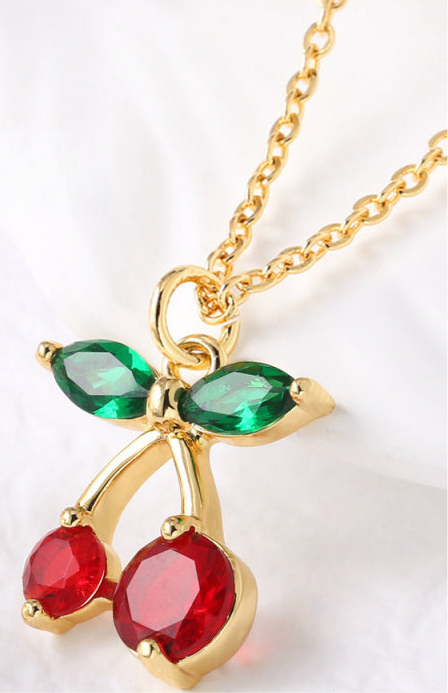 π Cherry Luxe Necklace β shimmering red cherries with dainty emerald leaves.